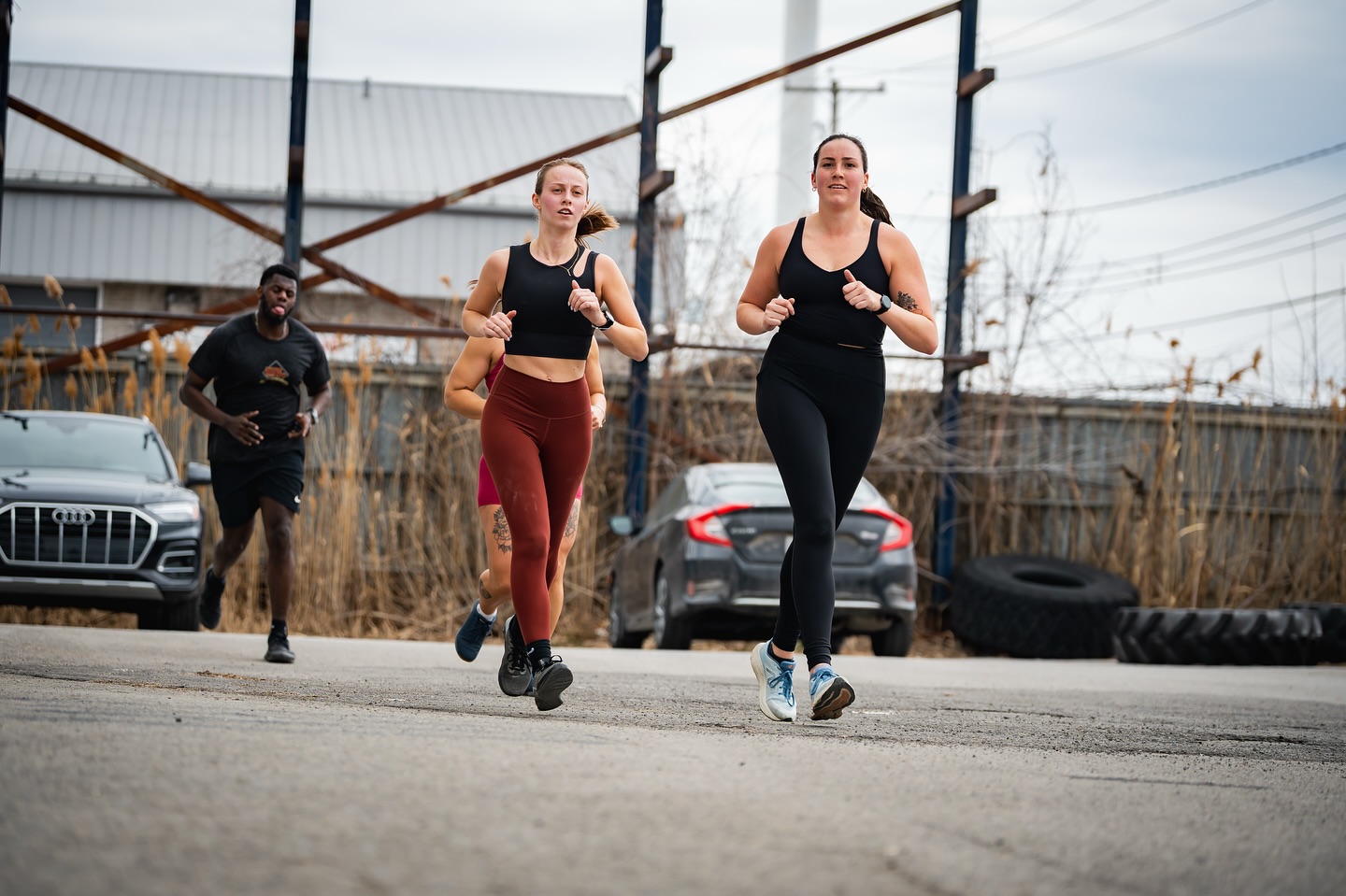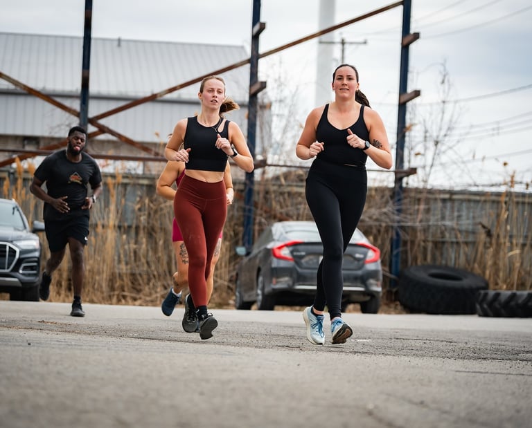 Séquences de course intercalées avec des stations (traîneaux, wallballs, rameur, burpees…)